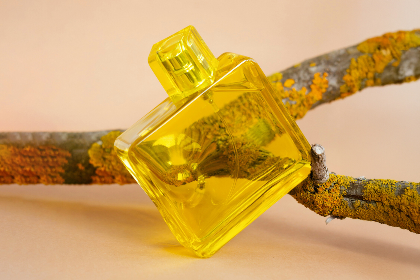 Бесплатный мокап желтой стеклянной бутылки для парфюма
