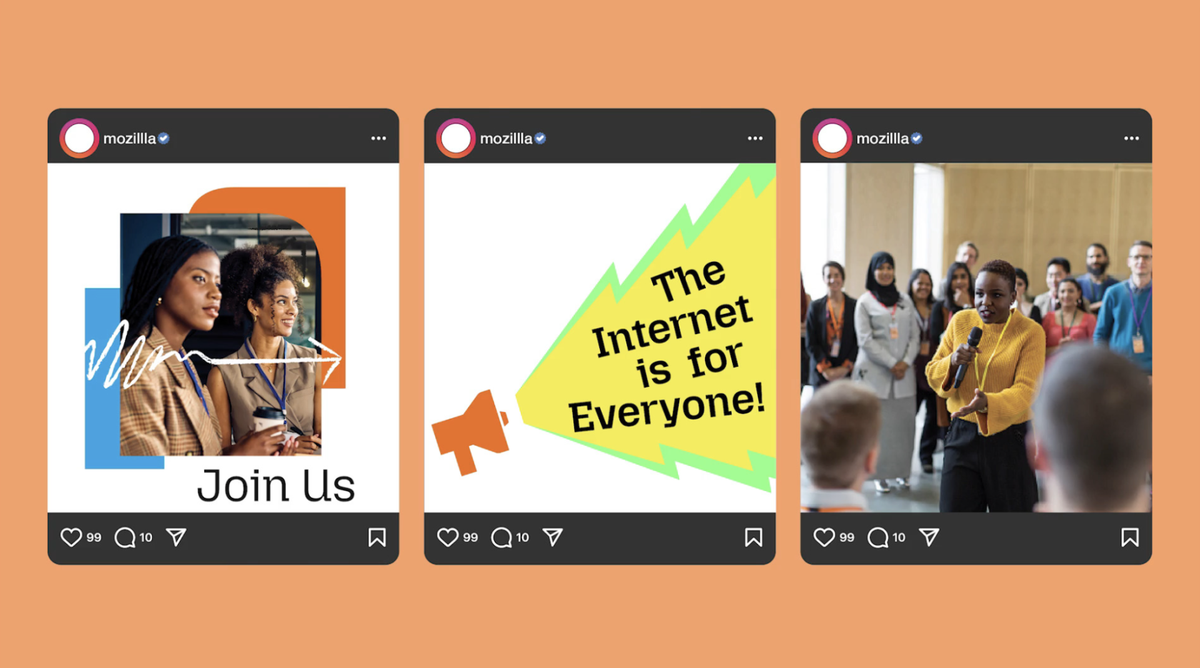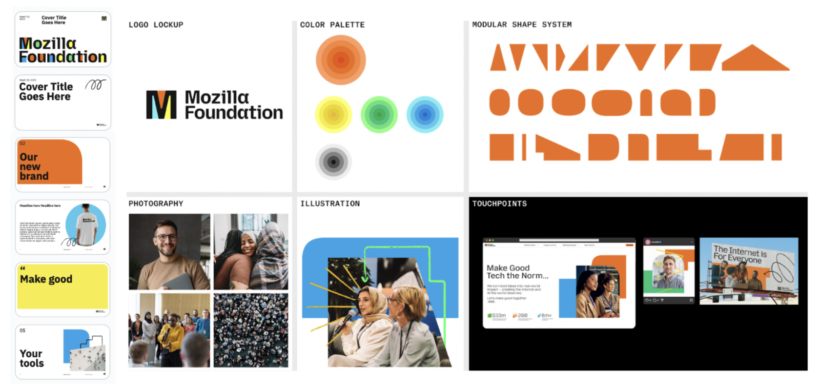 Её концепция понравилась Наташе Джен из Pentagram, которая поняла, как связать 25-летнее наследие Mozilla с чем-то более глобальным и чувственным. Визуальная система строилась на модульных «строительных блоках», которыми можно управлять, меняя их местами, но сохраняя при этом системы значений и узнаваемость.