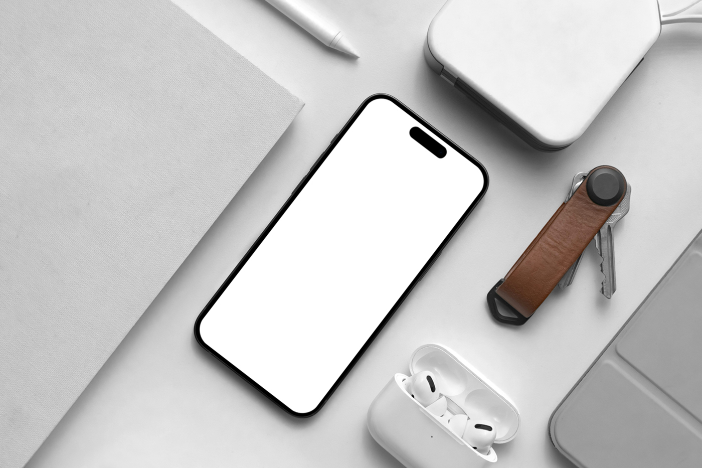 Во-вторых, мокап прежде всего фокусируется на деталях: стильный iPhone и книга, расположенные на белом столе, создадут идеальную атмосферу для вашего контента. ☁️ Этот мокап станет вашим незаменимым помощником в создании потрясающих визуализаций.