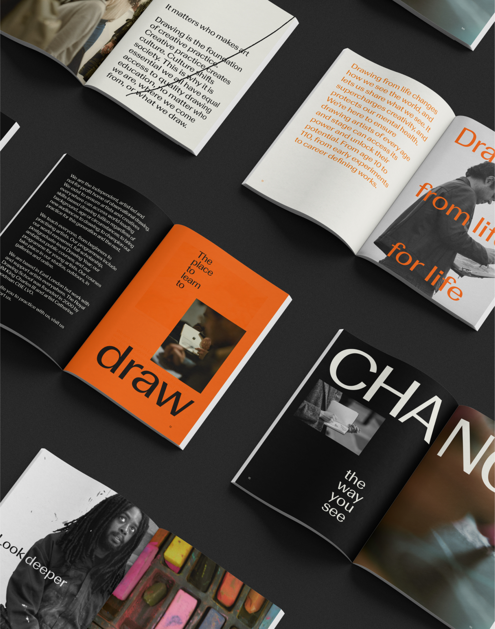 Визуальный язык был дополнен фотографией; Рори Лэндон-Дауэн был назначен для документирования жизни в школе. Его снимки запечатлевают творческие моменты: от чернильных пальцев до сосредоточенных фигур, работающих над мольбертами. В этих изображениях присутствует тепло и близость, отражающие дух заведения.