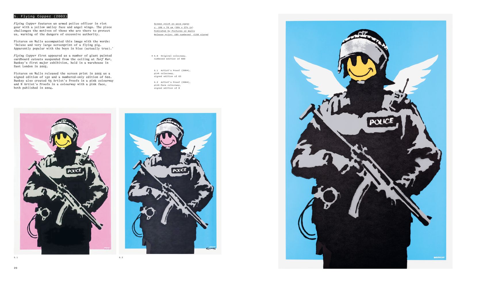 Этот тщательно исследованный том документирует каждую известную печатную версию, произведенную между 2002 и 2022 годами — 51 официальная версия, состоящая более чем из 170 уникальных вариаций, в общей сложности около 30,000 отдельных гравюр. Для художника, чьи работы «известно принадлежат улицам,» эти гравюры сыграли важную демократизирующую функцию; как замечает Роберт в своем предисловии: «[Они] сделали его искусство доступным более широкой аудитории, сохраняя доступные цены и доступность для людей любого достатка.»
