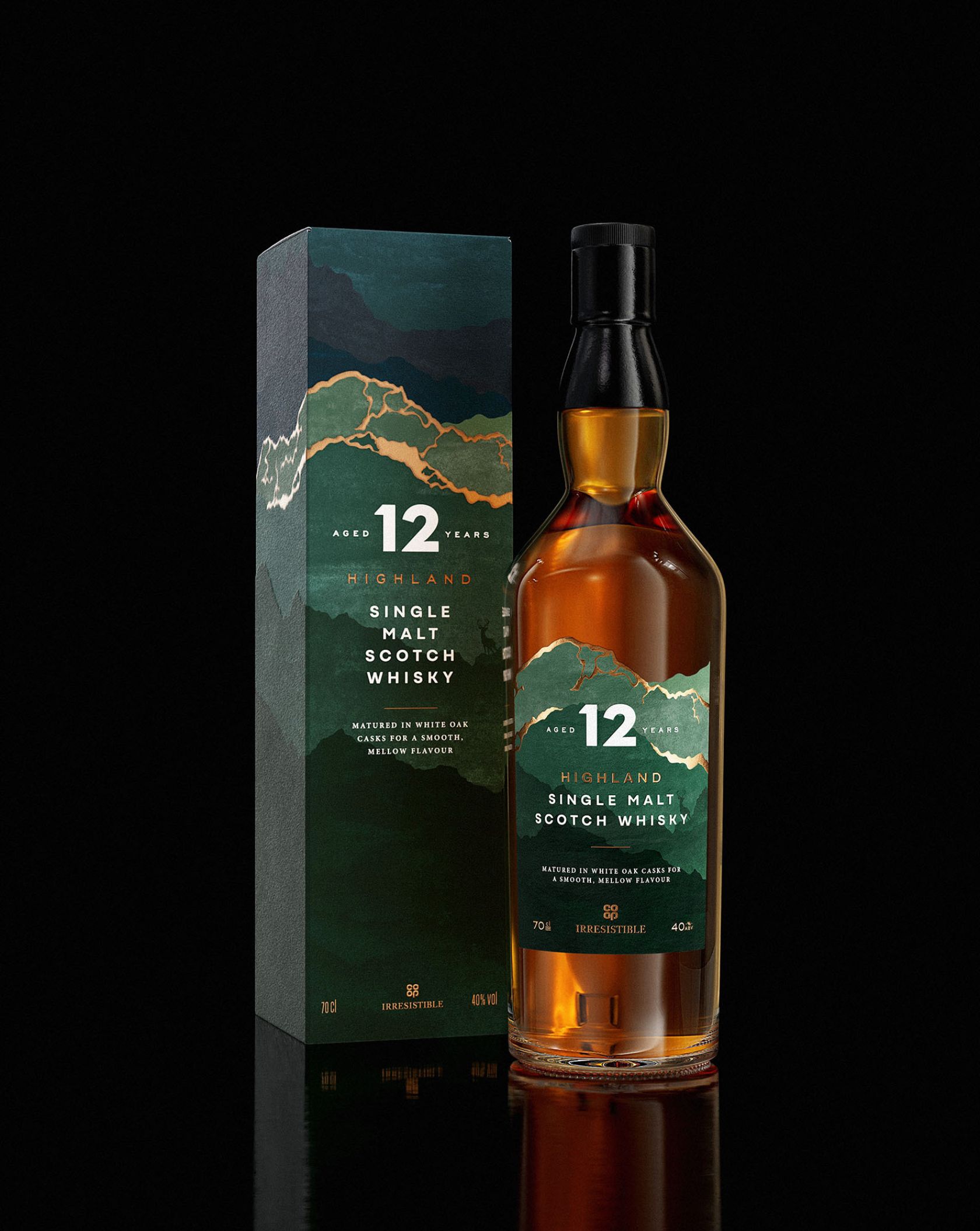 Каждый продукт черпает вдохновение из своих корней. Например, смешанный скотч 12-летней выдержки передает драматизм Шотландских высокогорий с грубыми текстурами, нестандартными формами этикеток и изысканной типографикой. В то время как односолодовый виски опирается на традиционный дизайн килта с глубокими цветами и смелой диагонально нарезанной этикеткой, дополненной медными акцентами.