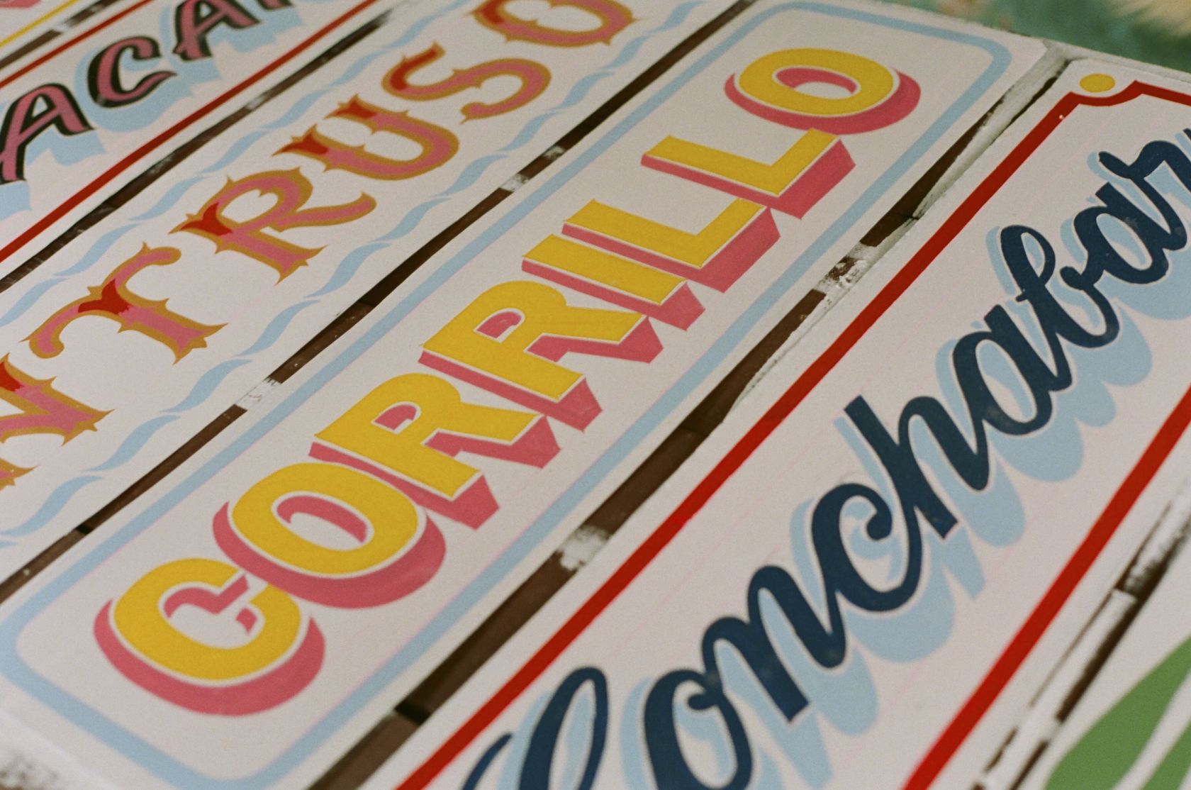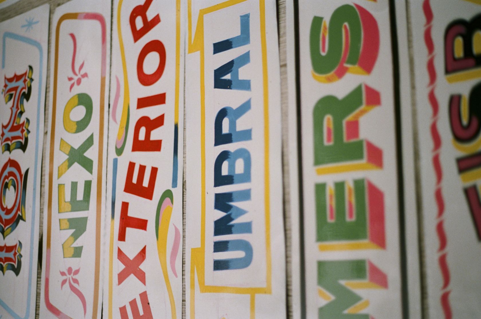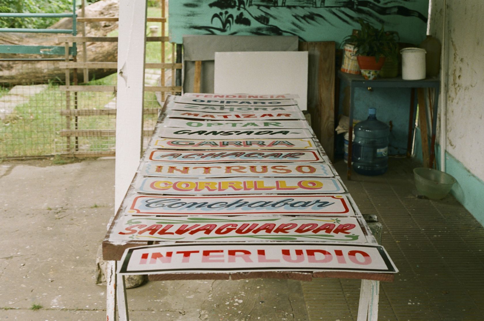«Я подумал, что довольно интересно будет попросить его расписать слова, которые он обычно не расписывает,» объясняет Сантьяго. «Не ‘мороженое’ или ‘газировка’, а что-то другое. Я был удивлён его выбором. Он извлёк старый словарь и выбрал свои любимые слова, в том числе некоторые древние испанские слова, которые больше не употребляются. На обратной стороне каждого знака он написал определения.»